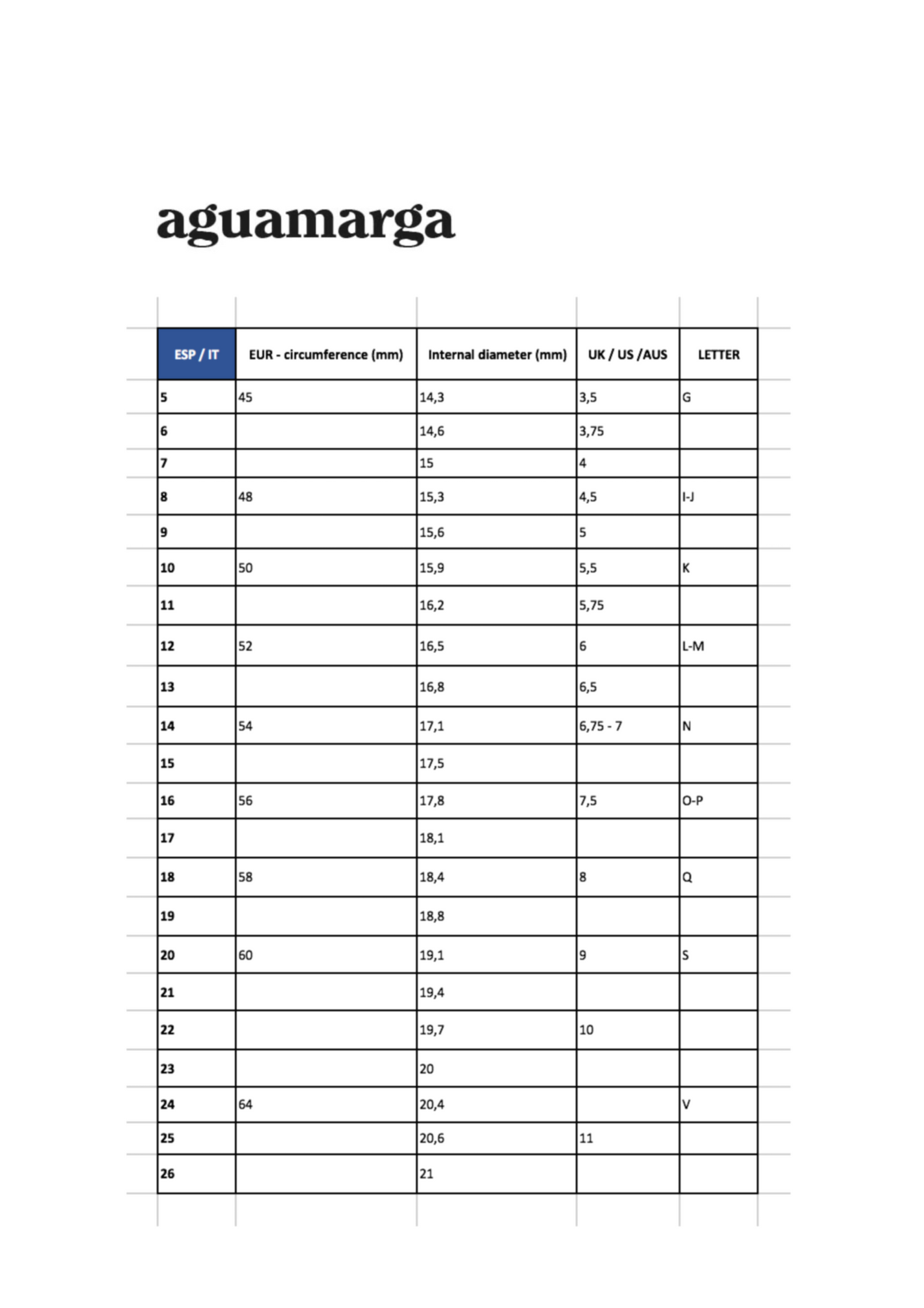 At Aguamarga, I follow standard ESP/IT number sizing. Check the conversion chart below for measurements and conversions. If your size isn't listed or you're between sizes, simply select the closest EU size and add a comment at checkout with your preferred size.