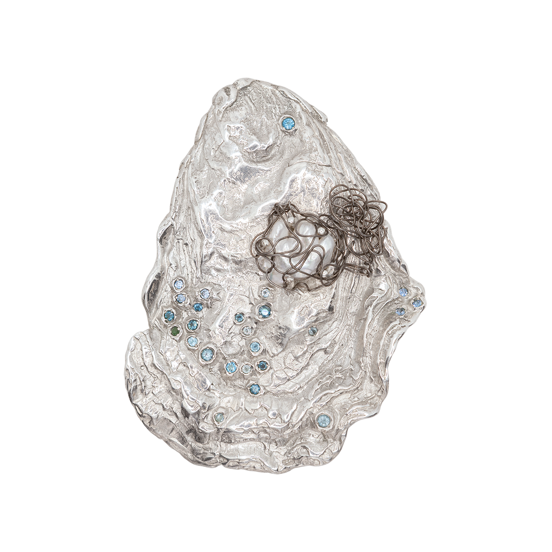 A natural oyster cast in silver and redesigned in the shape of a fish becomes a symbol of an organism forced to produce pearls under human intervention, exposing the hidden violence behind its apparent beauty. The cultured pearl, caught under a handwoven iron net, embodies capture, overfishing, and the artificialization of marine life. The twenty-five bezel-set topazes sparkle like fragments of crystallized water, yet also evoke fragile flashes at risk of disappearing.