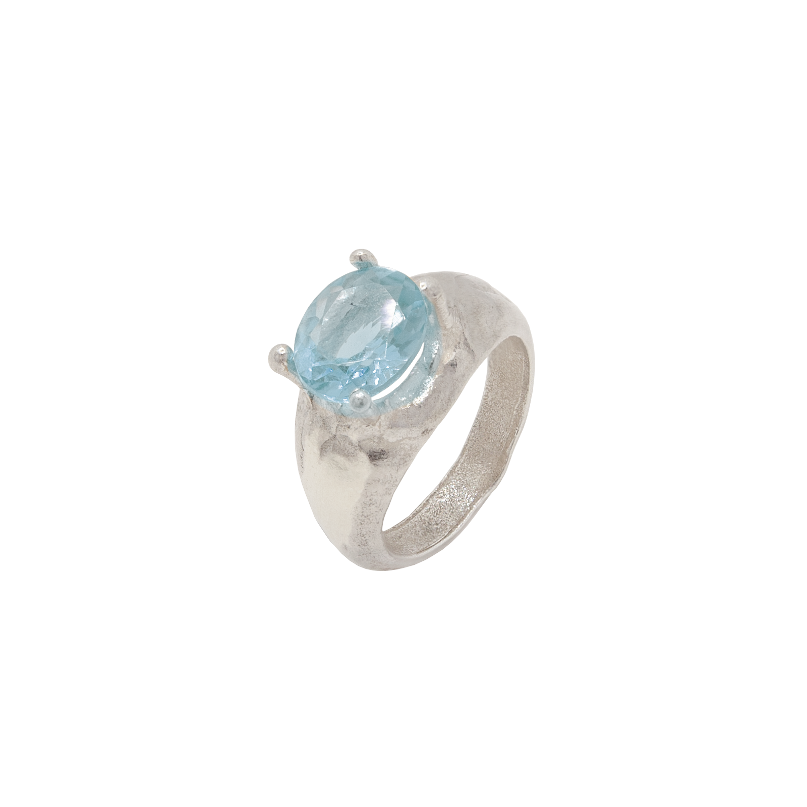 Handmade sterling silver oval ring with raw texture and a claw-set Topaz. The Aguamarga Studio logo is engraved on the body of the ring.