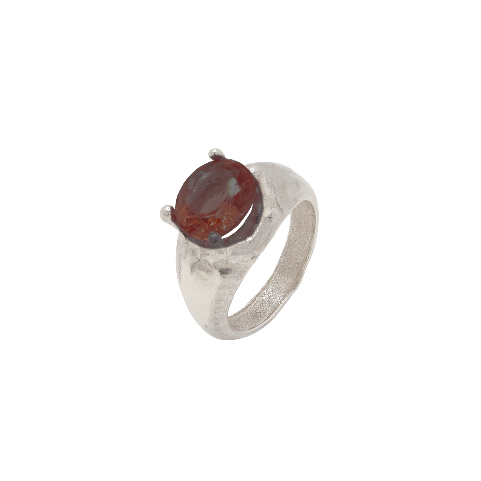 Handmade recycled silver oval ring with raw texture and a claw-set Garnet. The Aguamarga Studio logo is engraved on the body of the ring.