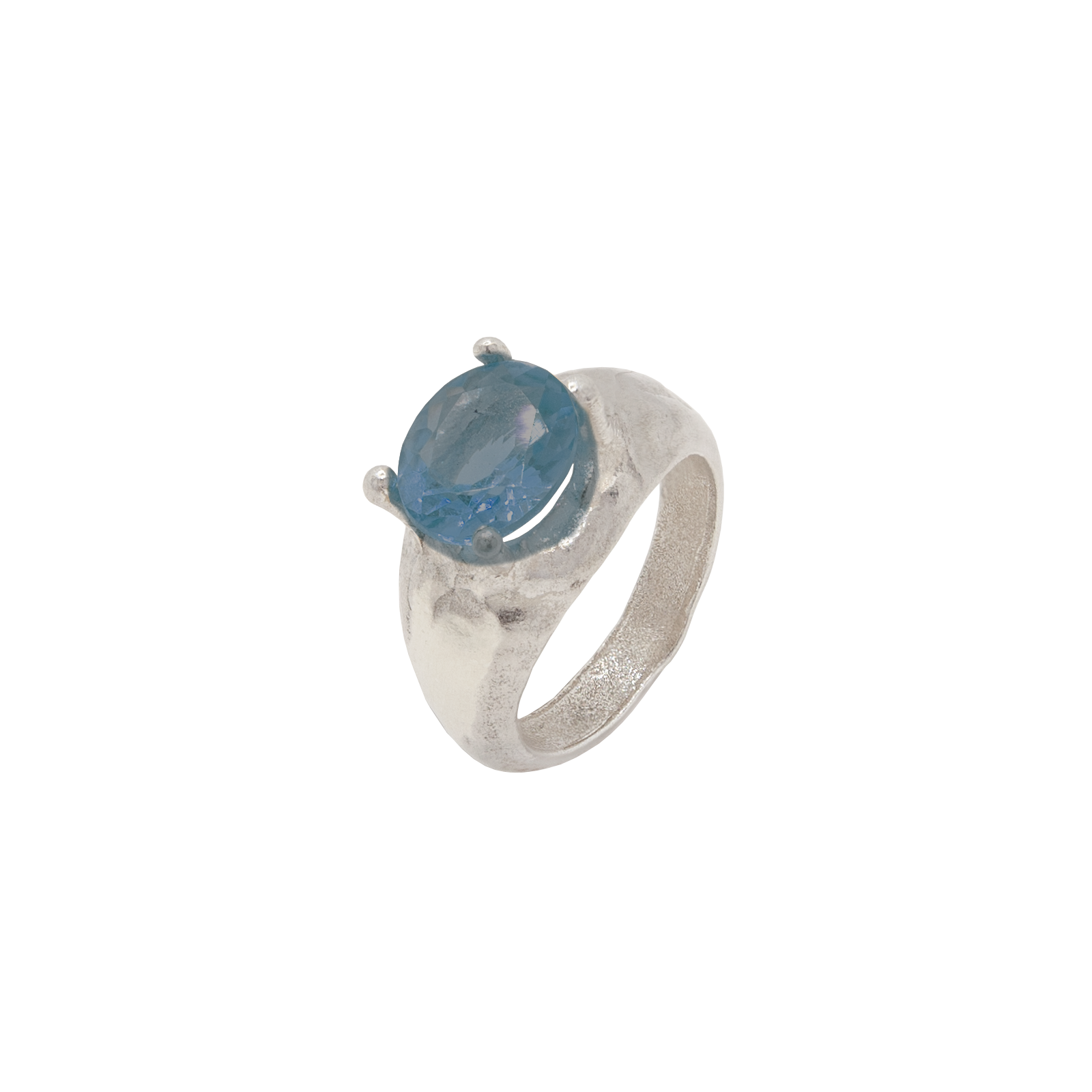 Handmade sterling silver oval ring with raw texture and a claw-set Topaz London Blue. The Aguamarga Studio logo is engraved on the body of the ring.