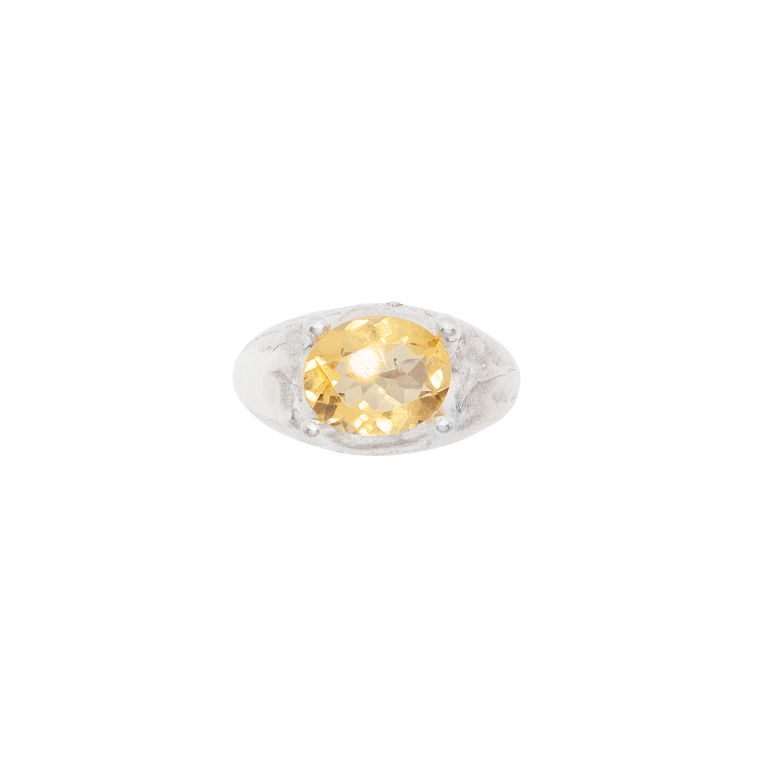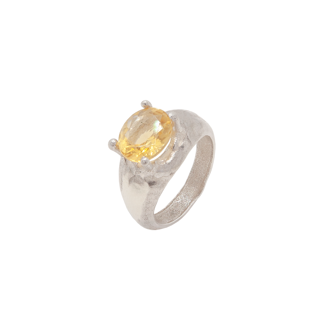 Handmade sterling silver oval ring with raw texture and a claw-set Citrine. The Aguamarga Studio logo is engraved on the body of the ring.
