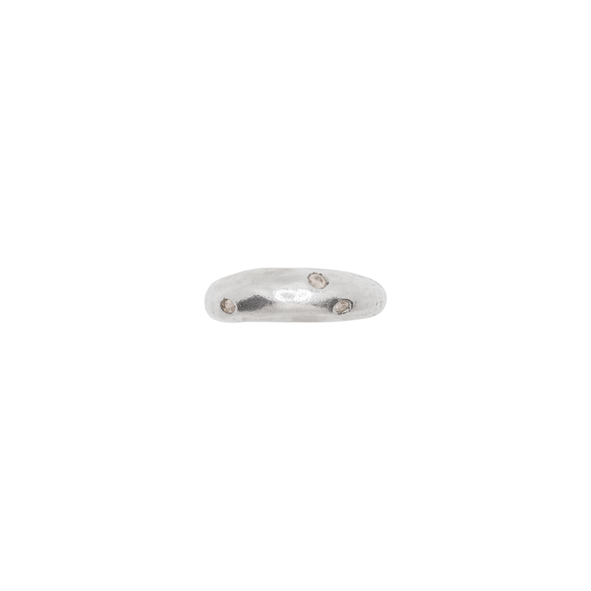 Handmade sterling silver band ring with raw texture and three level-setting Smoky Quartz. The Aguamarga Studio logo is engraved on the body of the ring.