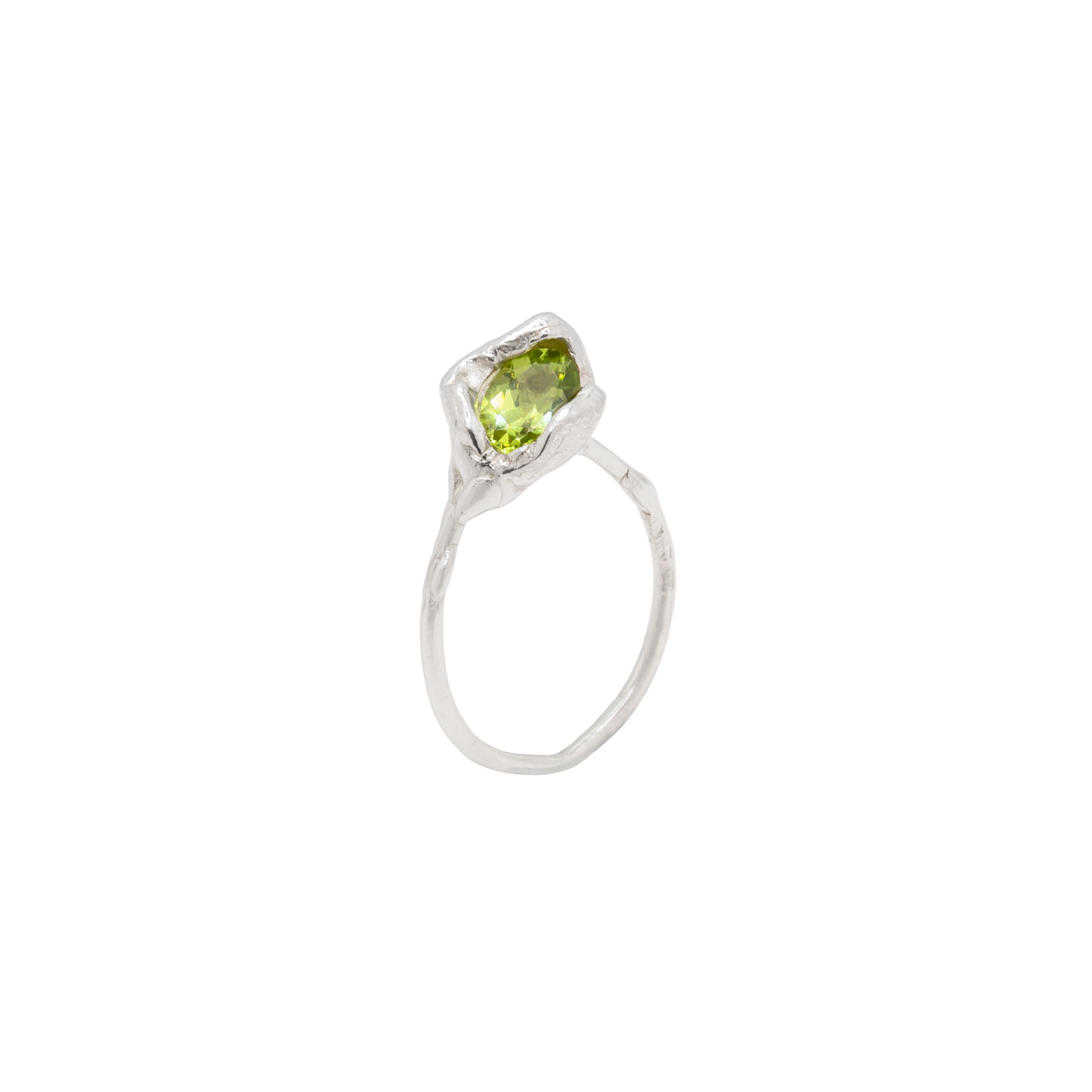 Handmade sterling silver thin ring featuring a firefly with raw texture and a Peridot.
