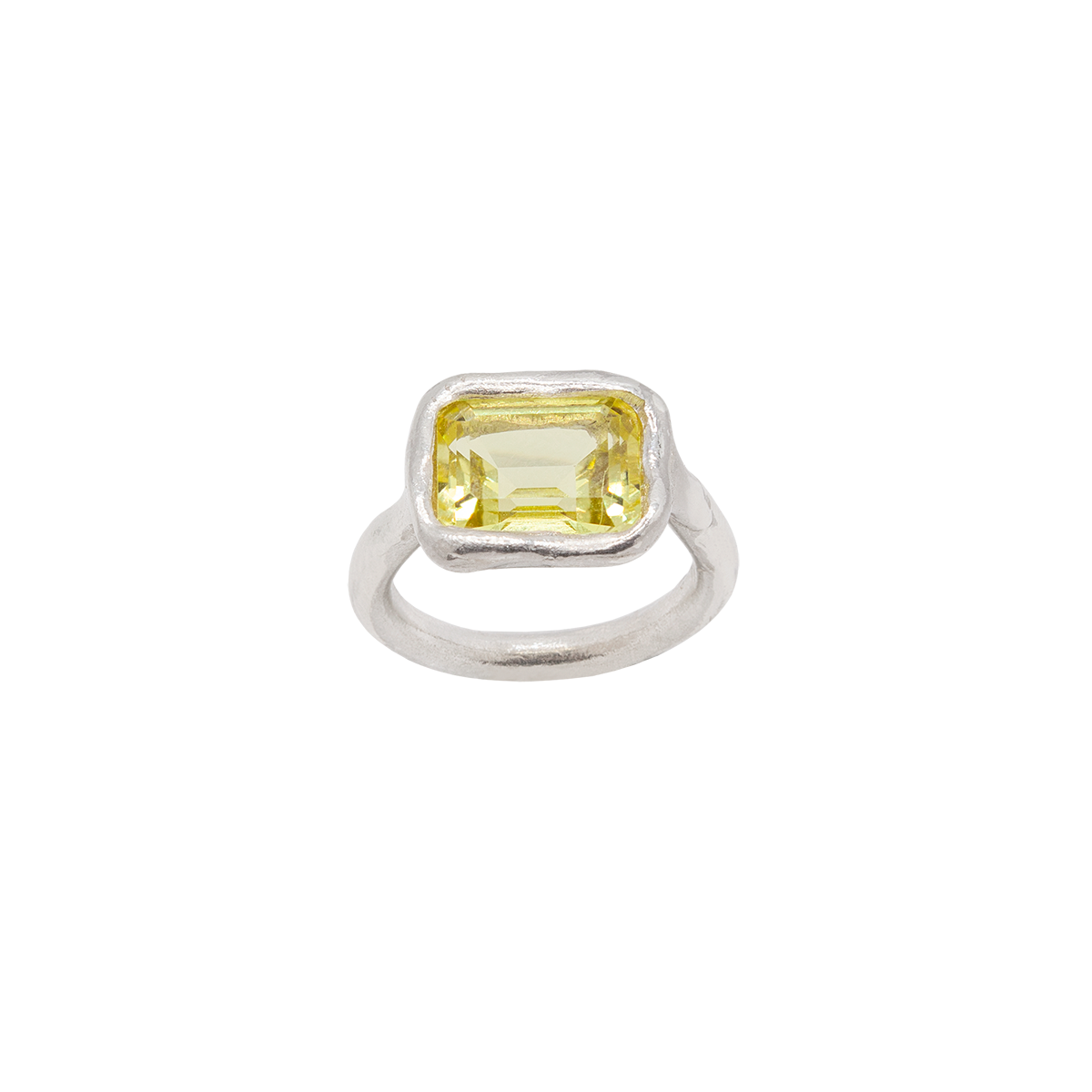 Handmade sterling silver ring with raw texture and level-setting Lemon Citrine. The Aguamarga Studio logo is engraved on the body of the ring.