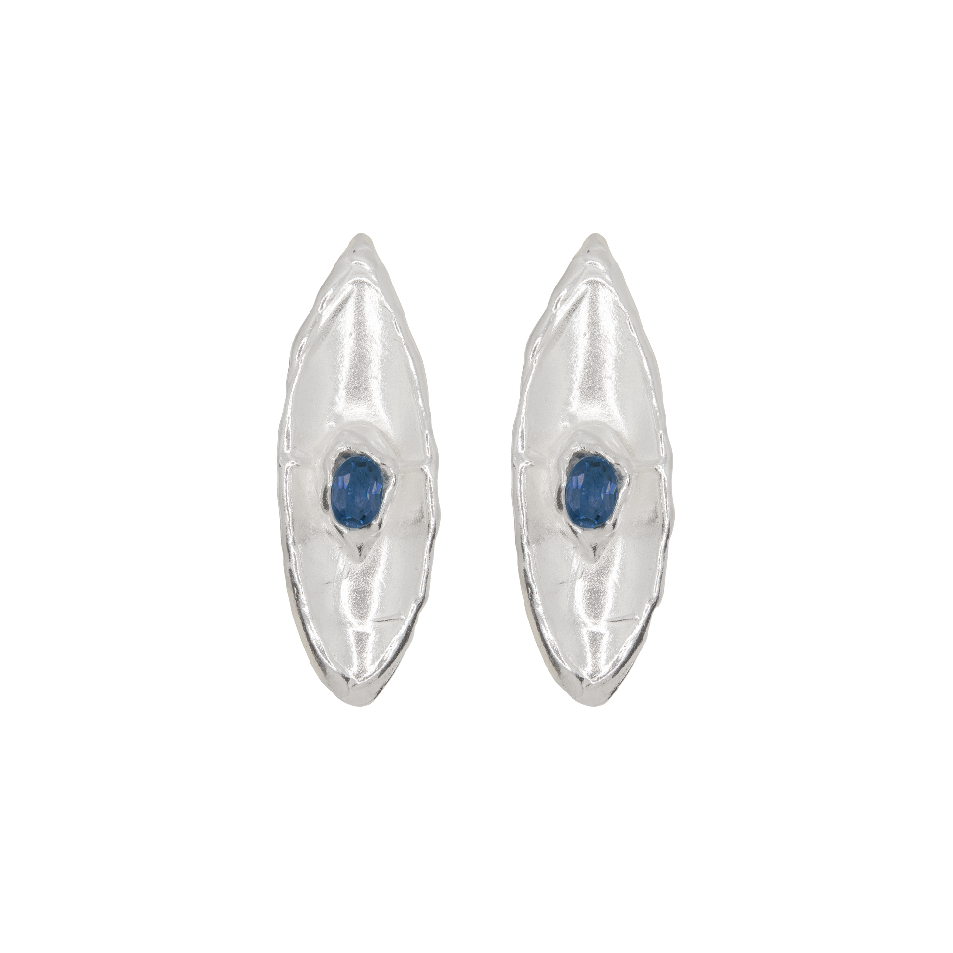 Handmade sterling silver earrings featuring leafs with Topaz London Blue. The Aguamarga Studio logo is engraved on the body of the earrings.