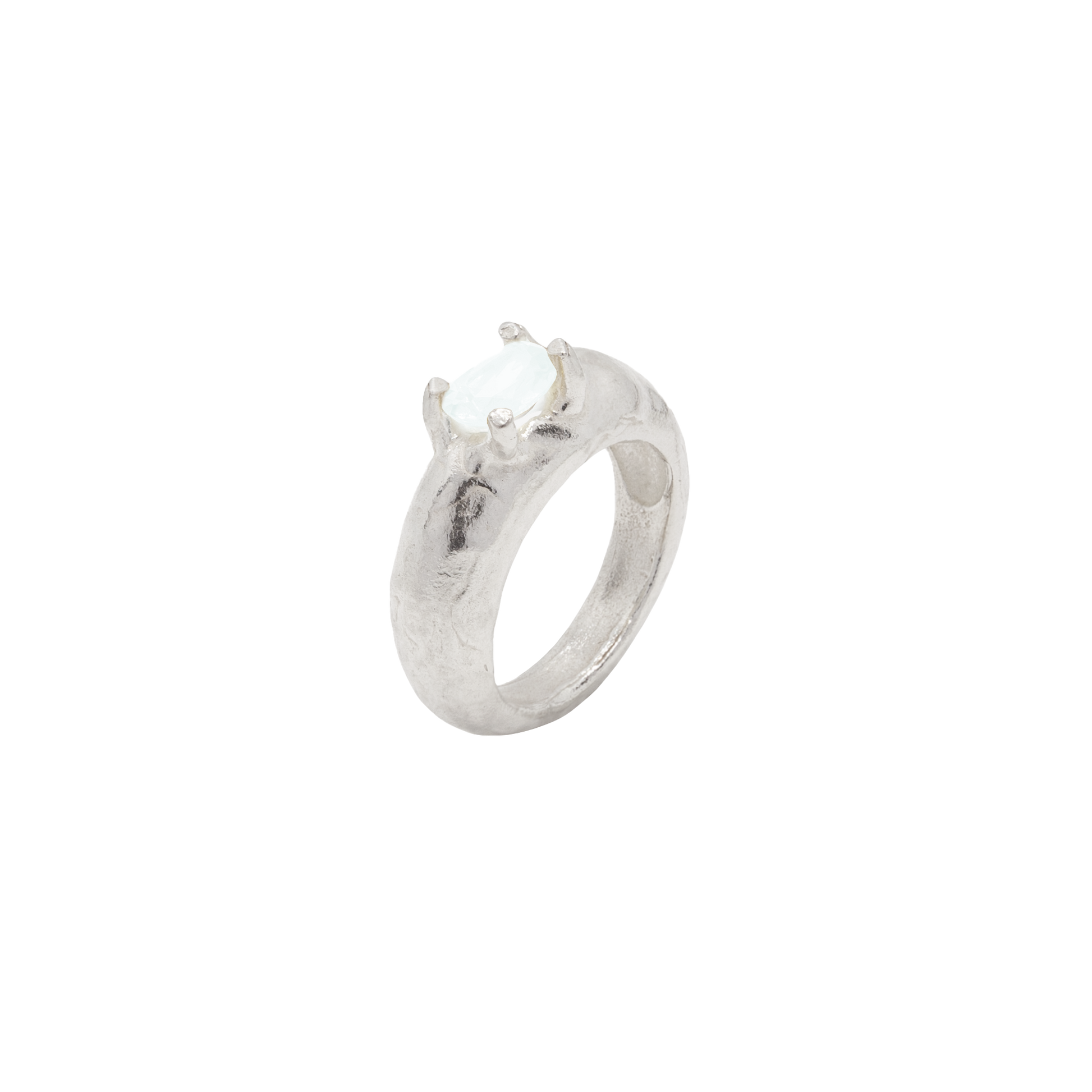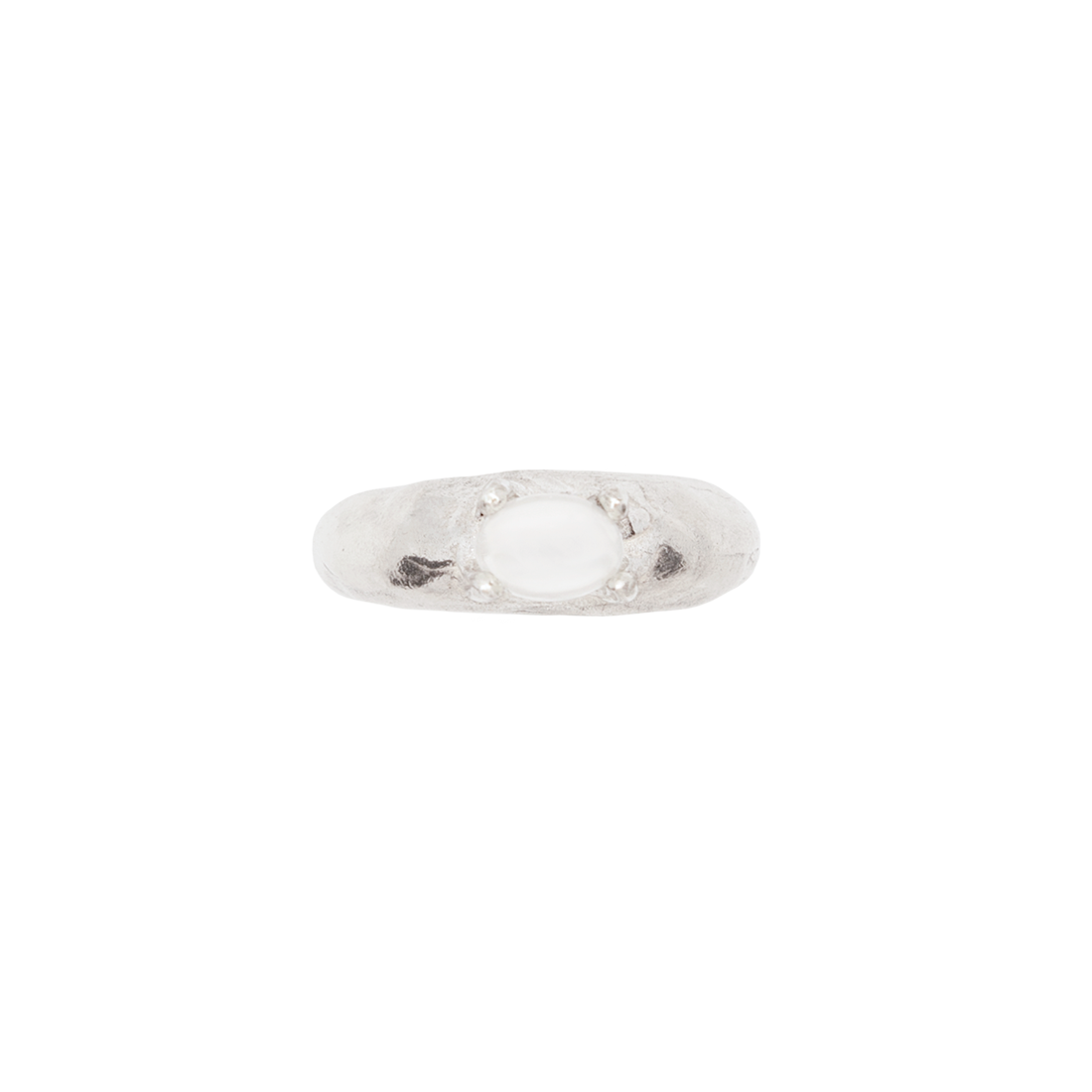 Handmade sterling silver band ring with raw texture and a claw-set Moonstone. The Aguamarga Studio logo is engraved on the body of the ring.