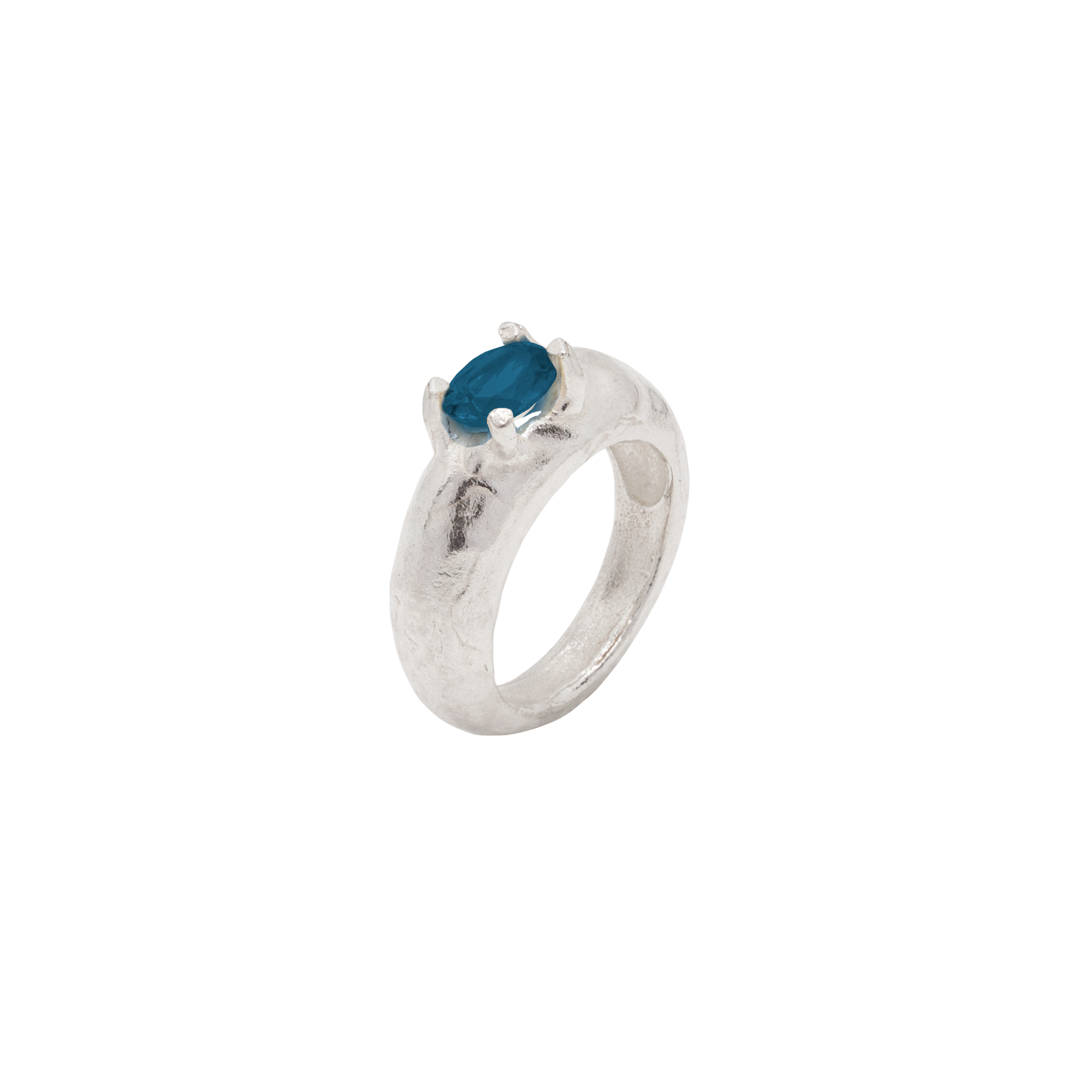 Handmade sterling silver band ring with raw texture and a claw-set Topaz London Blue. The Aguamarga Studio logo is engraved on the body of the ring.